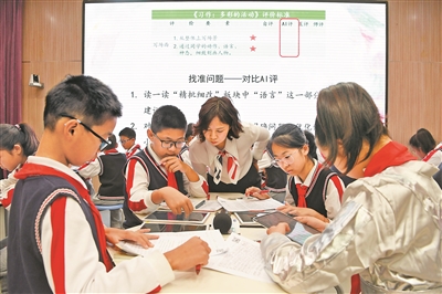 在北京市海淀区第四实验小学《多彩的活动》主题语文公开课上,老师借助AI评改指导学生。新华社记者 马宁 摄