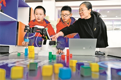 在山东省日照市新营小学,牟娟老师指导学生使用人工智能机械臂。新华社记者 郭绪雷 摄